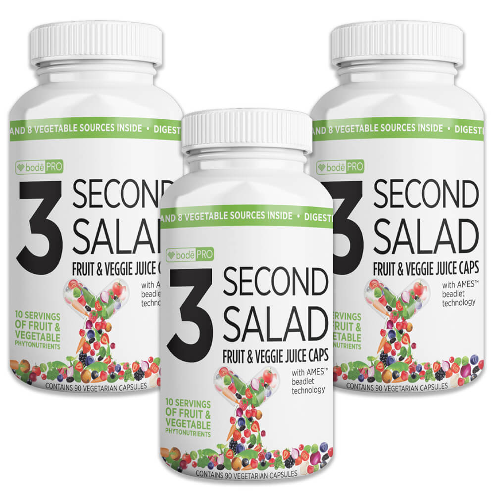 The physician formulated 3 Second Salad provides the phytonutrient equivalent of 10 servings of fruits & veggies all contained inside a convenient, portable, and ready to take capsule.† Just 3 seconds a day can help lead to a healthier you.